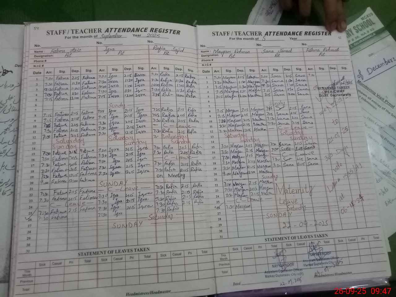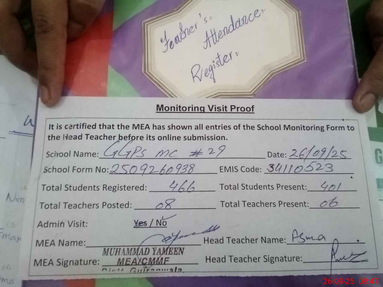 | Attendance Register | Head Teacher | MEA with School | Visit Proof |
