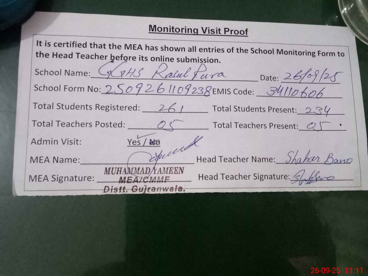 | EMIS Code: 34110606 | Name of School: GGPS RASOOL PURA | |||