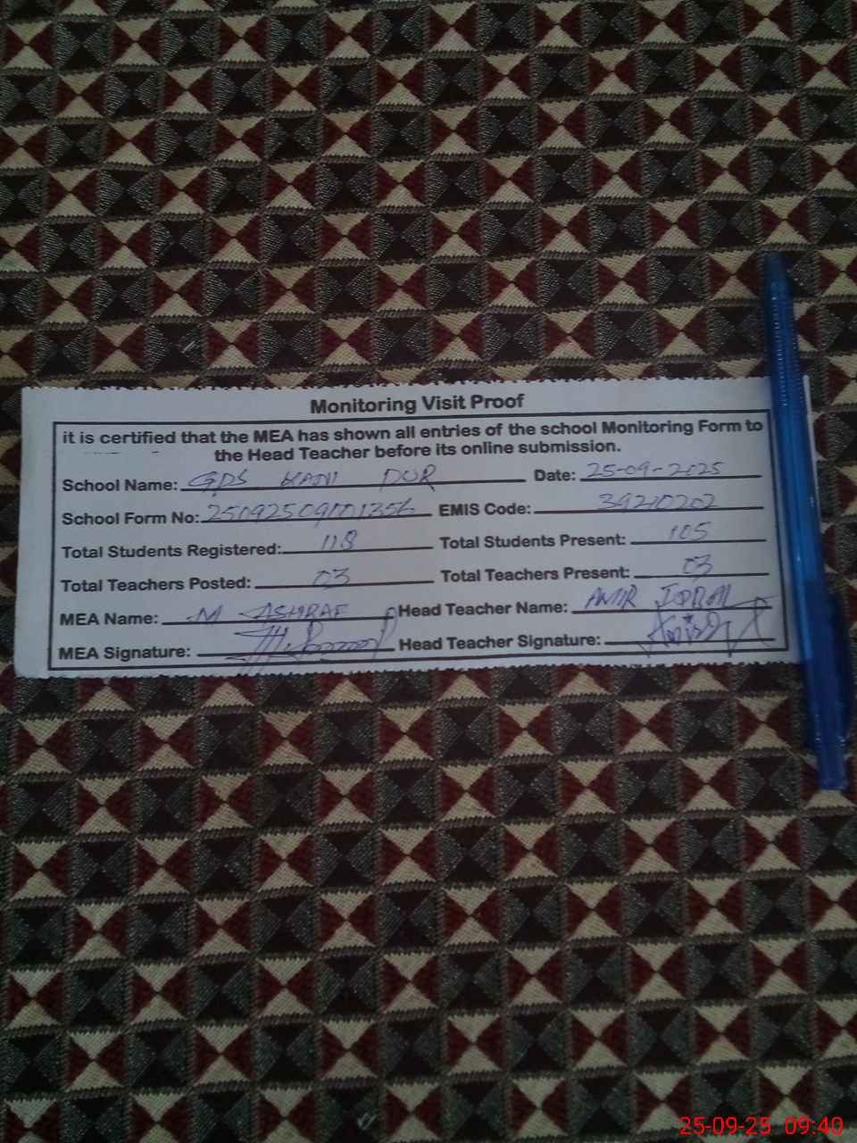 | Attendance Register | Head Teacher | MEA with School | Visit Proof |