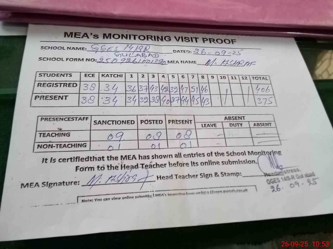 | Attendance Register | Head Teacher | MEA with School | Visit Proof |