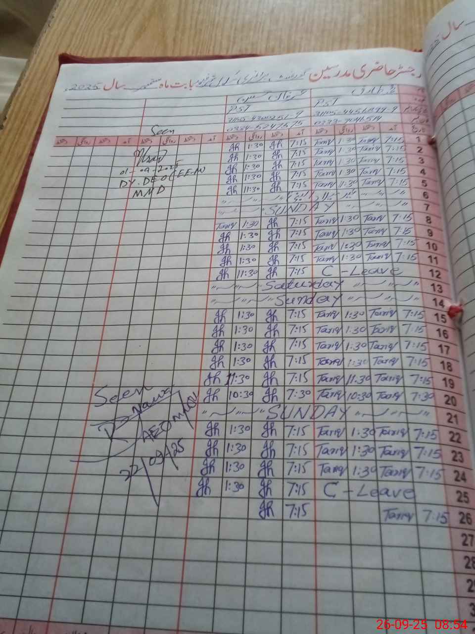 | CNIC | Full Name | Designation | R/C | Absence During Last Calender Month |