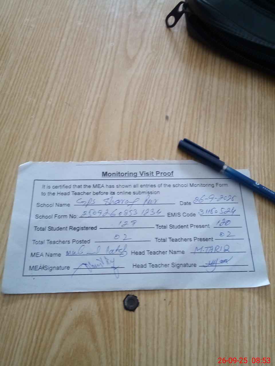 | Attendance Register | Head Teacher | MEA with School | Visit Proof |