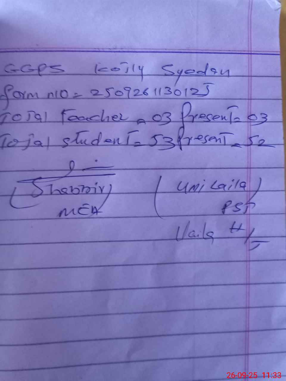 | Monitoring Date: 26-09-2025 | Start Time: 26-09-2025 10:55 AM | End Time: 26-09-2025 11:34 AM | Name of MEA: Sh**** Hu**** | |