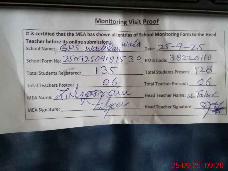 | EMIS Code: 38220110 | Name of School: GPS WADHLAN WALA | |||
