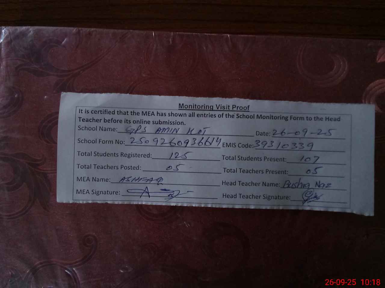 | Attendance Register | Head Teacher | MEA with School | Visit Proof |