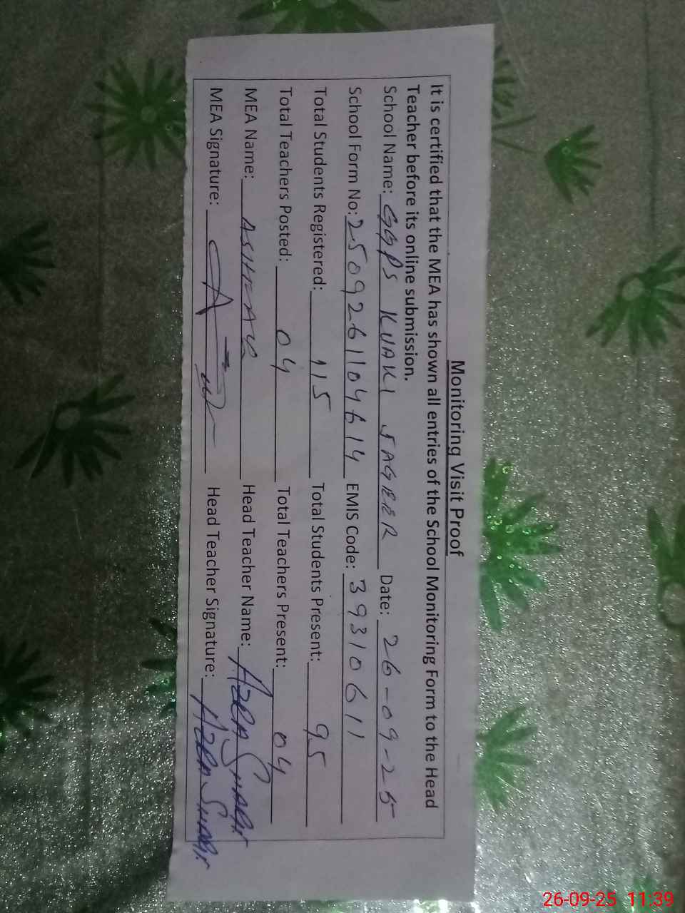 | Attendance Register | Head Teacher | MEA with School | Visit Proof |