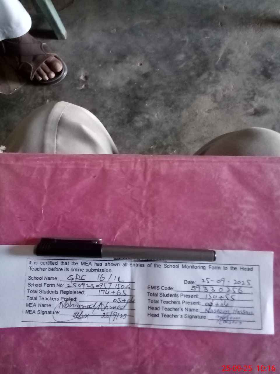 | EMIS Code: 39330256 | Name of School: GPS CHAK NO 16/1L | |||