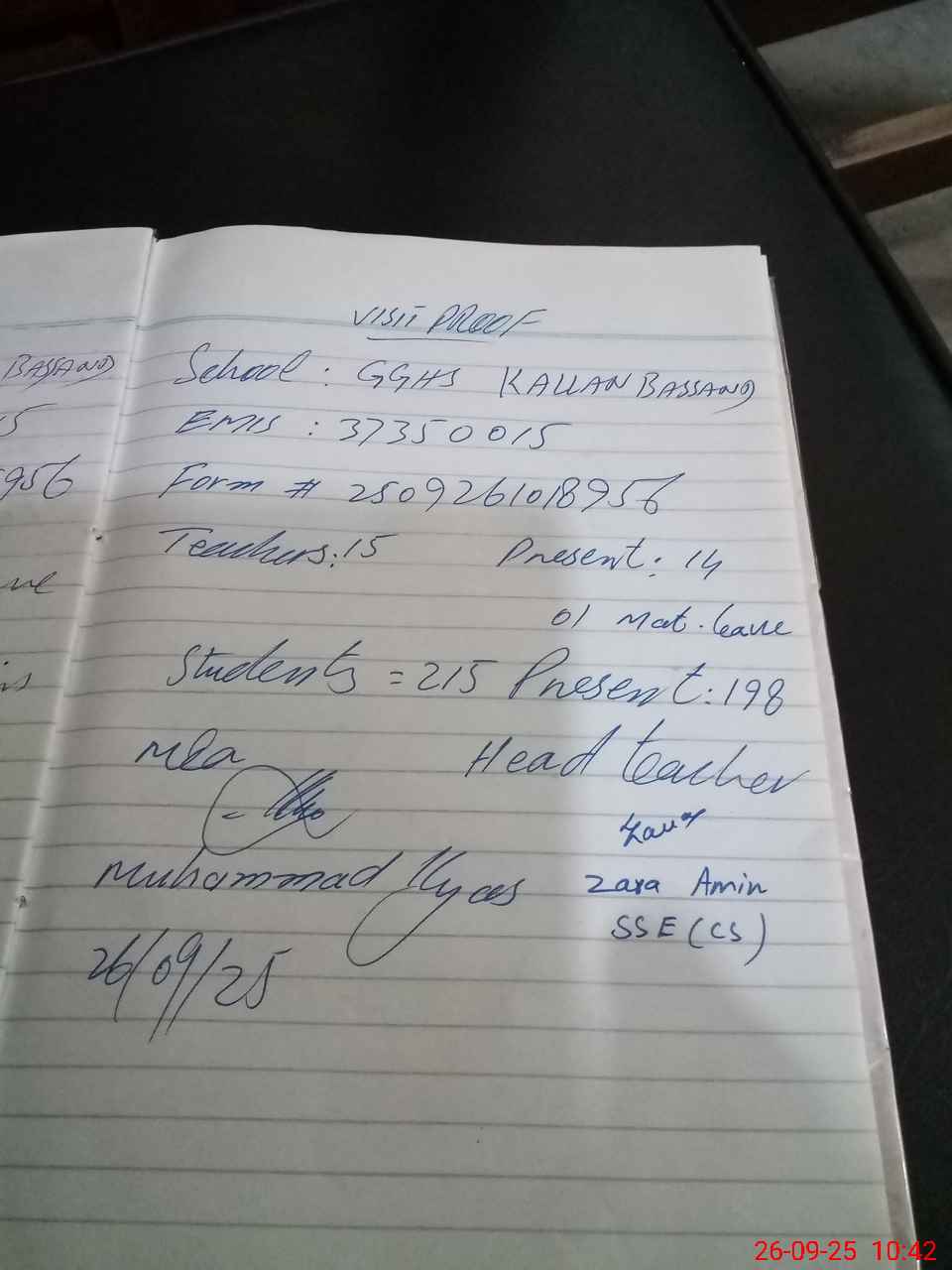 | Attendance Register | Head Teacher | MEA with School | Visit Proof |