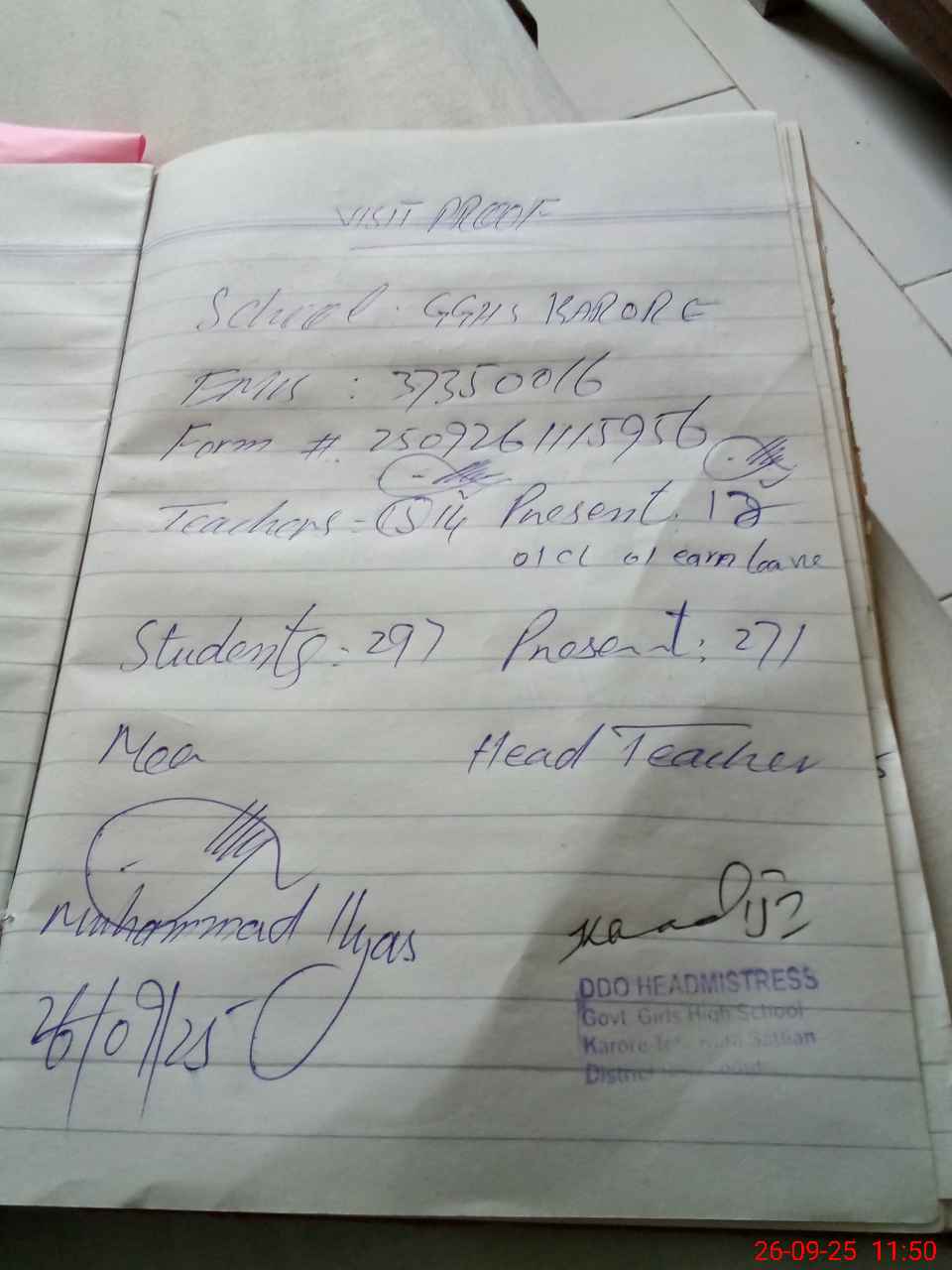 | Attendance Register | Head Teacher | MEA with School | Visit Proof |