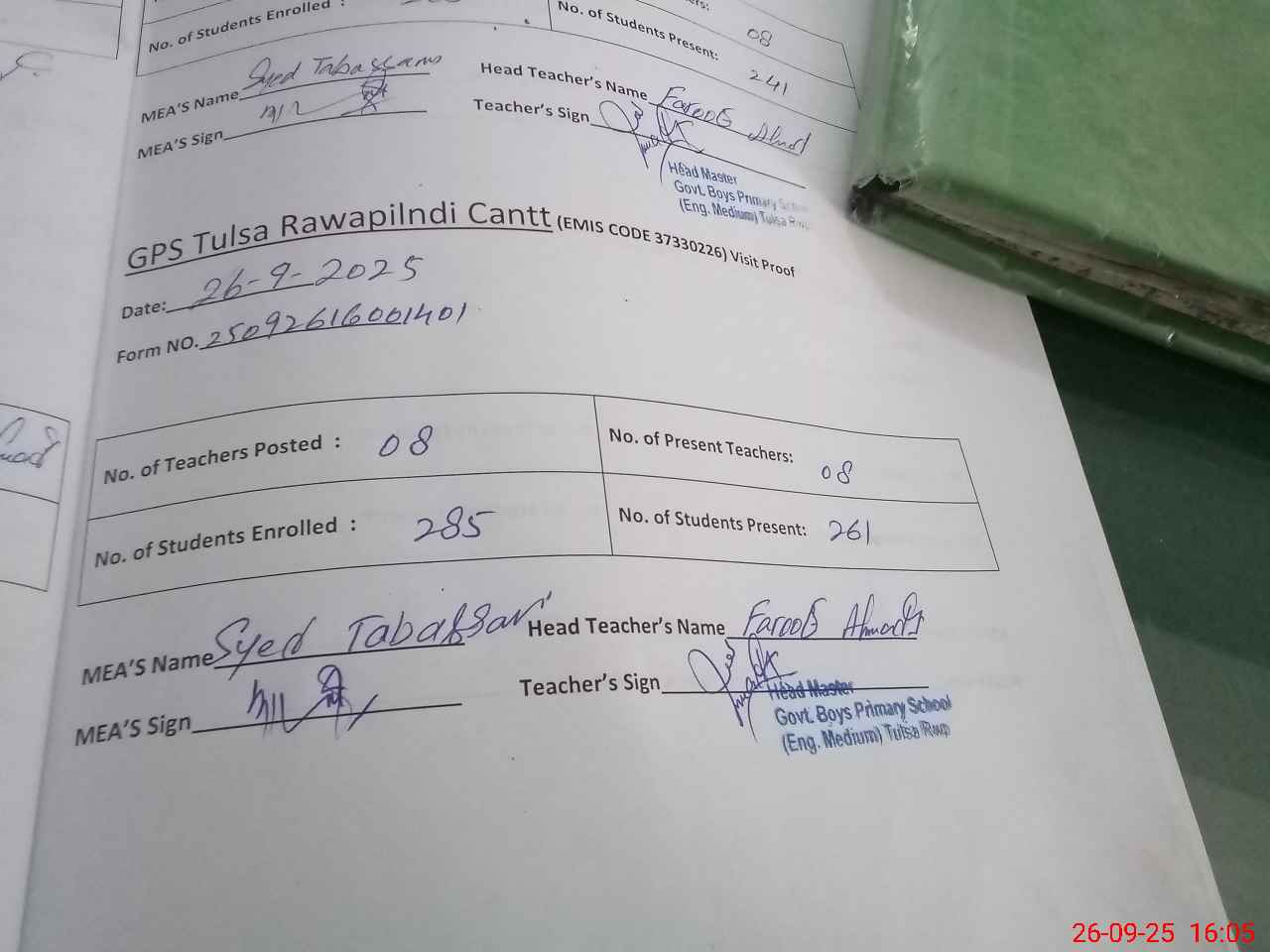 | Attendance Register | Head Teacher | MEA with School | Visit Proof |