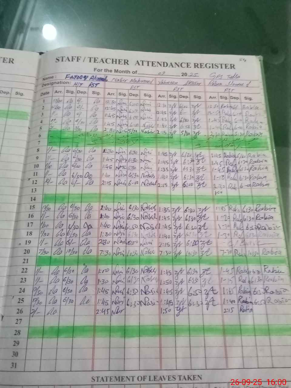 | Leave | Duty | Absent | Maternity | Medical | Ex- Pak |
