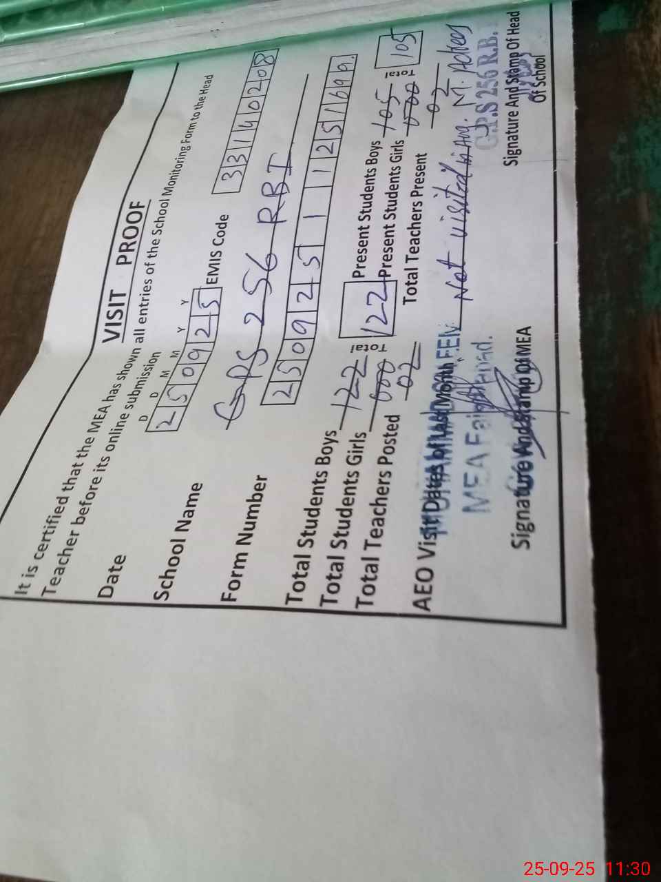 | Attendance Register | Head Teacher | MEA with School | Visit Proof |
