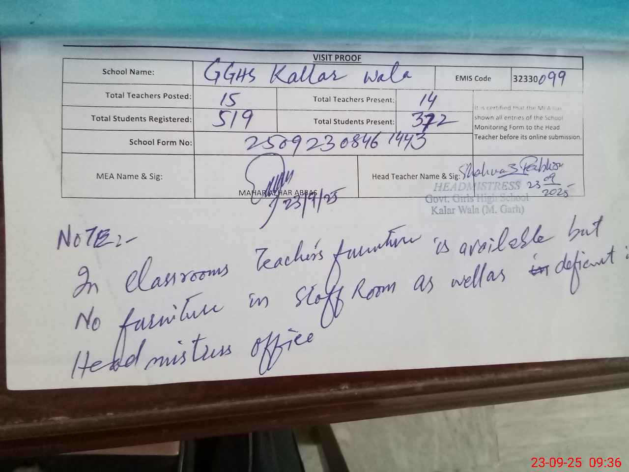 | Remarks (Use Separate Page if Required): A huge difference in Roznamcha and actual physical count of students Students in physical count are 372 whereas in Roznamcha No of Present students are 466 According to Headmistress most of the students are ABSENT due to HPV Vaccination | |||||