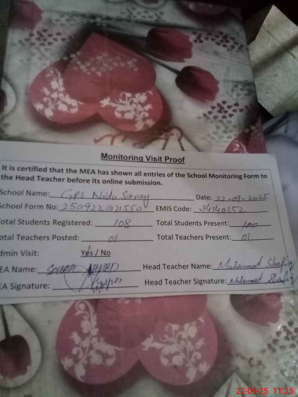 | Attendance Register | Head Teacher | MEA with School | Visit Proof |