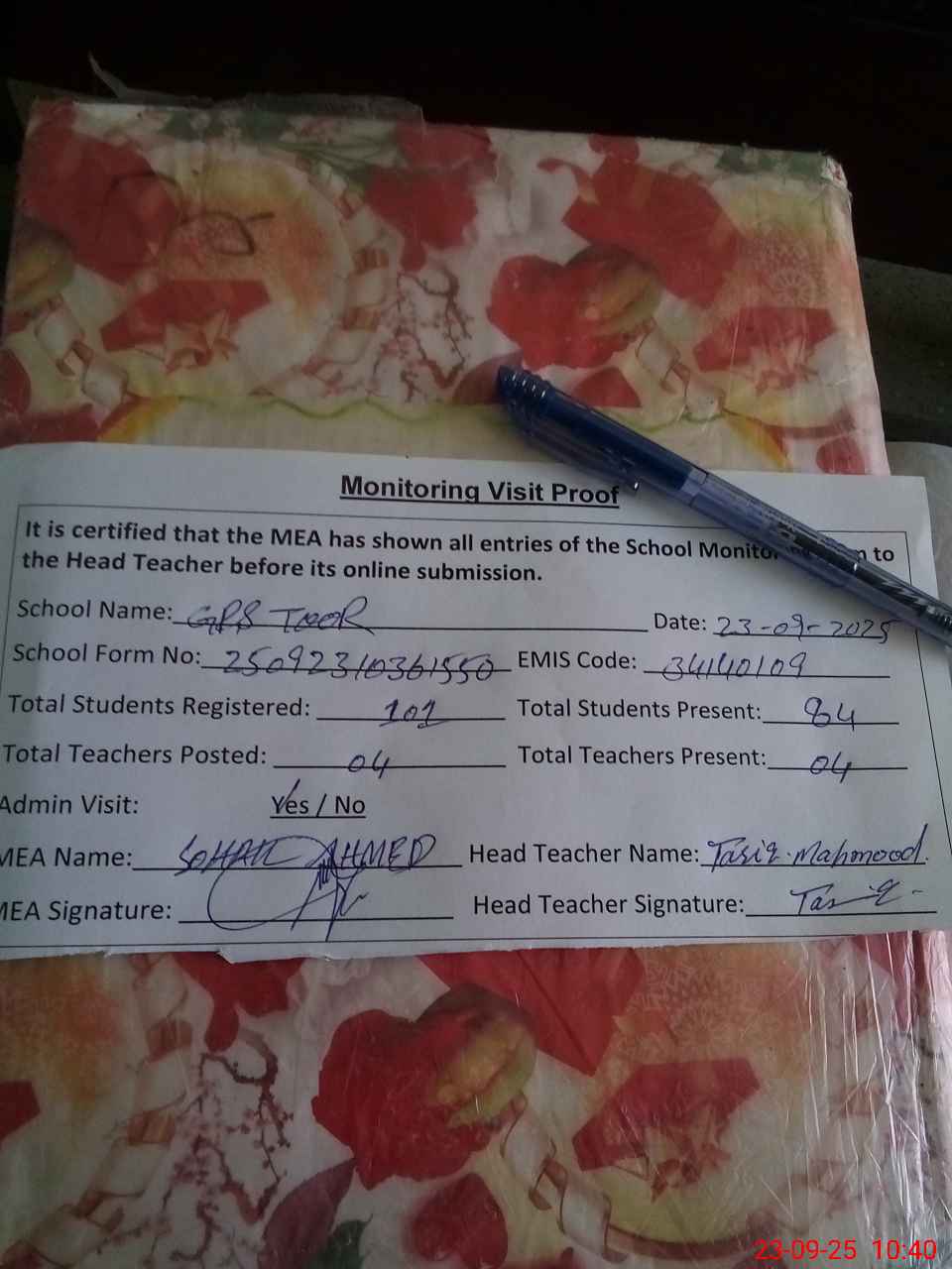 | Attendance Register | Head Teacher | MEA with School | Visit Proof |