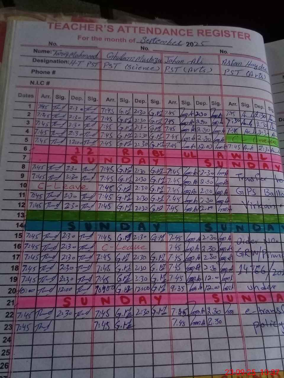 | CNIC | Full Name | Designation | R/C | Absence during last cal. month |