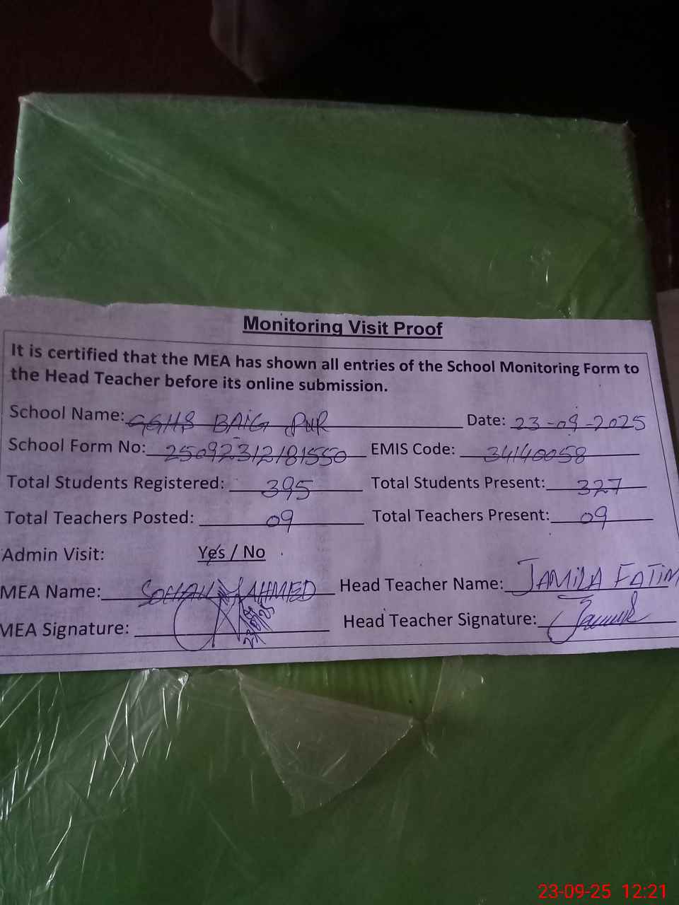 | Attendance Register | Head Teacher | MEA with School | Visit Proof |