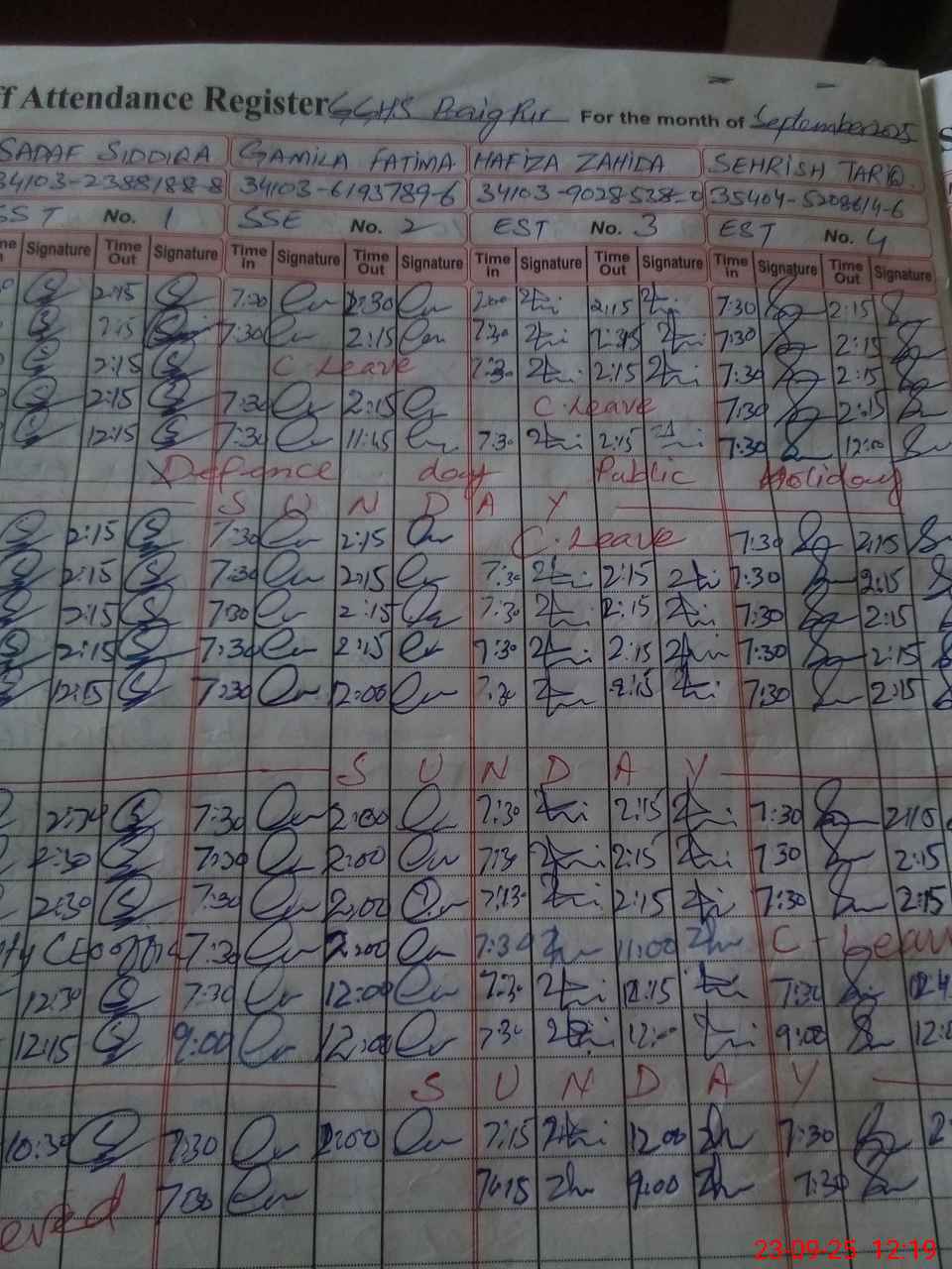 | CNIC | Full Name | Designation | R/C | Absence During Last Calender Month |
