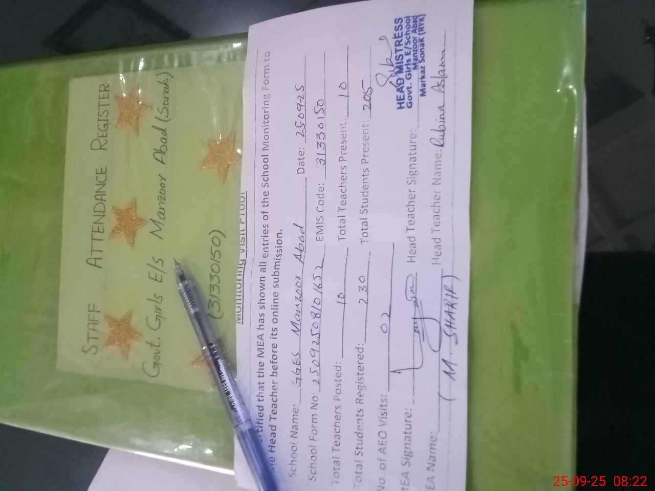 | Attendance Register | Head Teacher | MEA with School | Visit Proof |