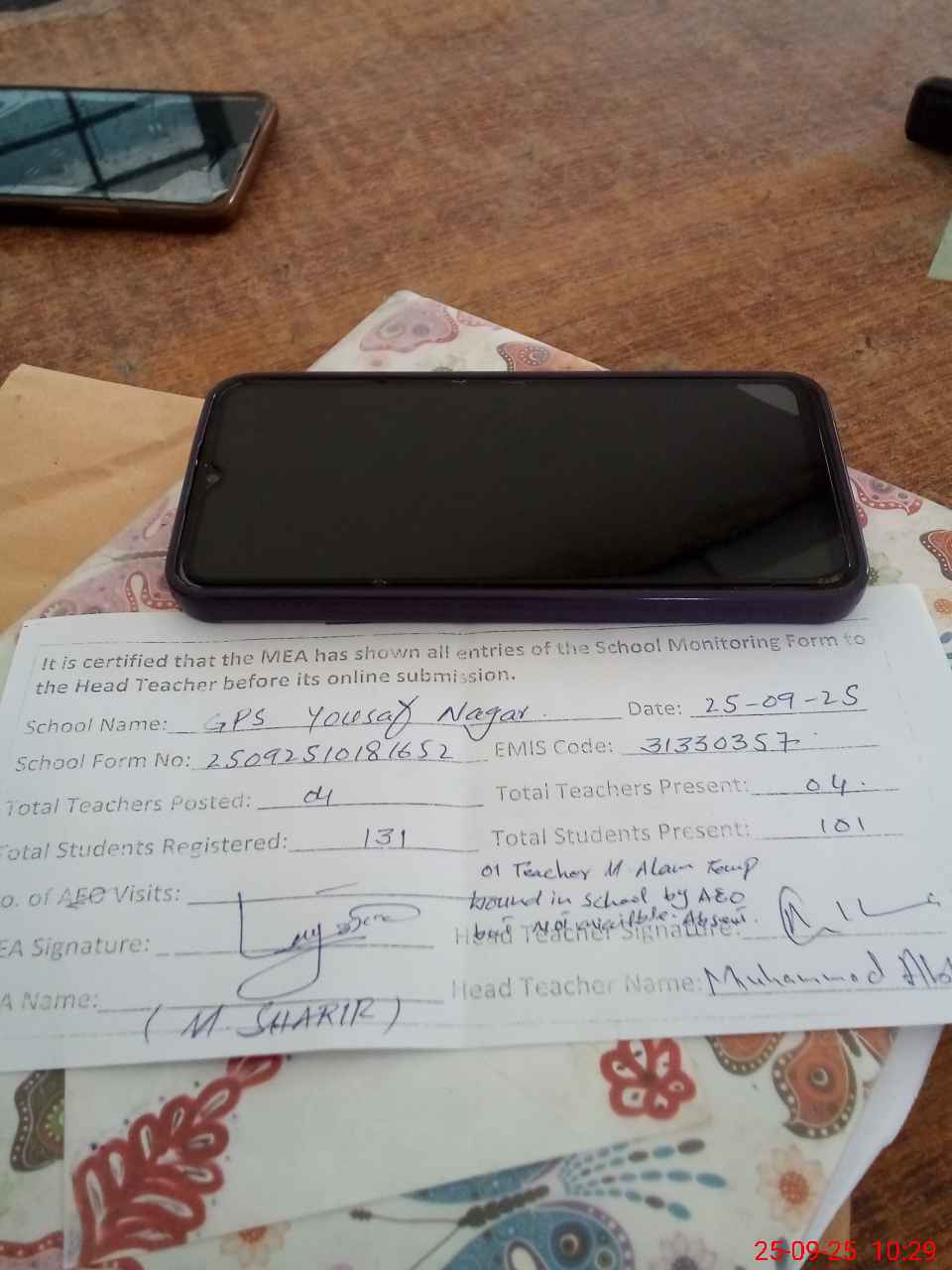 | Attendance Register | Head Teacher | MEA with School | Visit Proof |