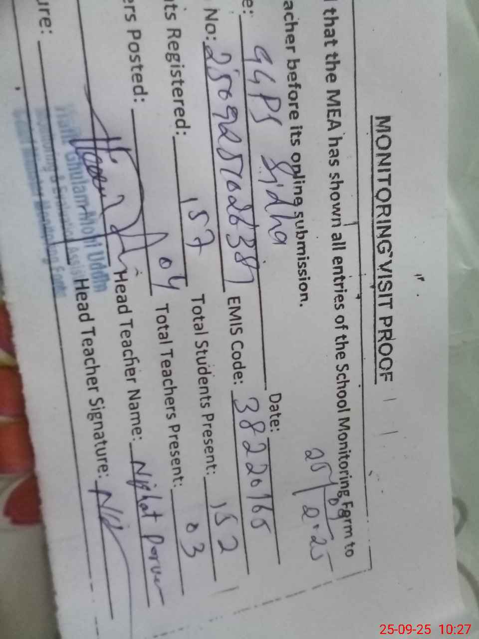 | Attendance Register | Head Teacher | MEA with School | Visit Proof |