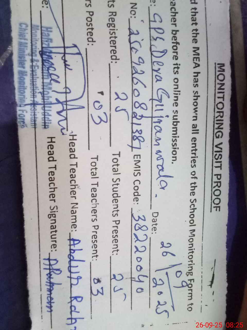| Attendance Register | Head Teacher | MEA with School | Visit Proof |
