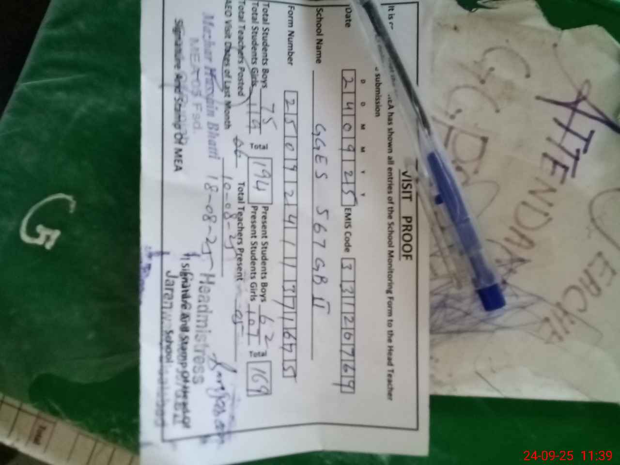 | Attendance Register | Head Teacher | MEA with School | Visit Proof |