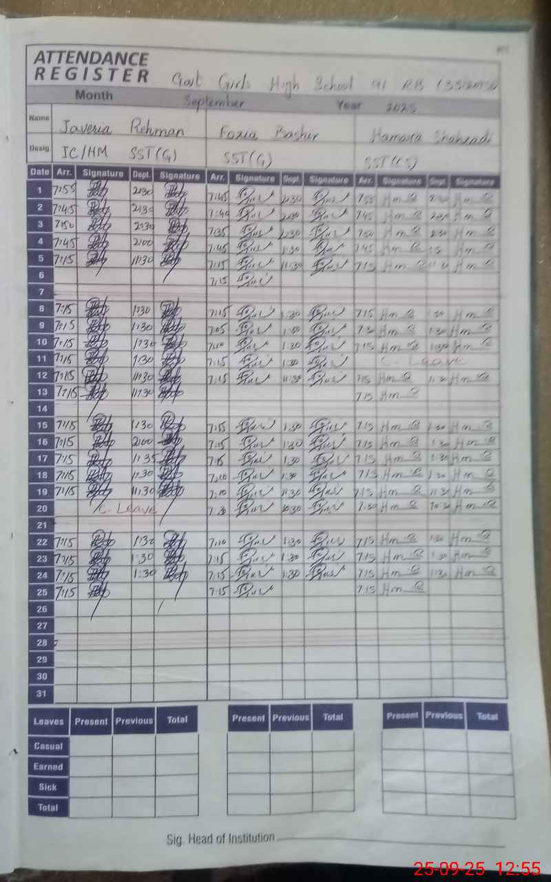 | CNIC | Full Name | Designation | R/C | Absence During Last Calender Month |