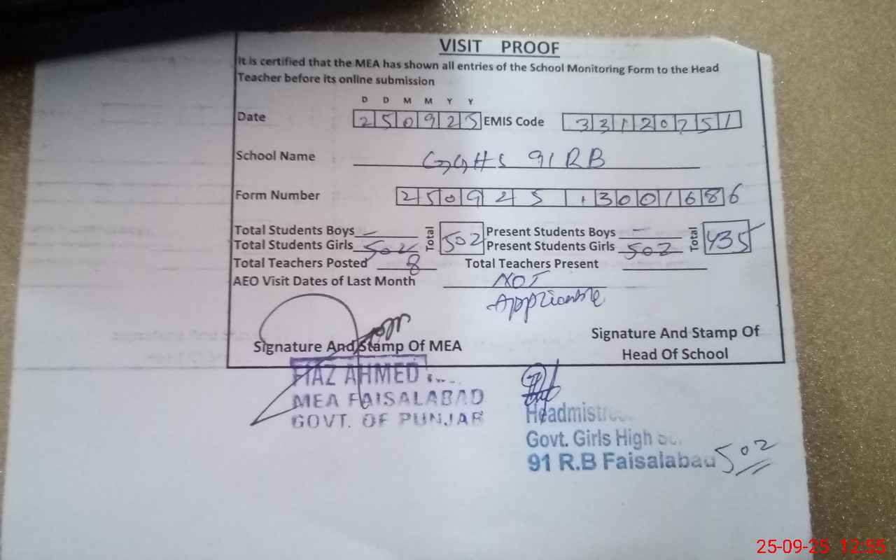 | EMIS Code: 33120751 | Name of School: GGHS CHAK 91 RB | |||