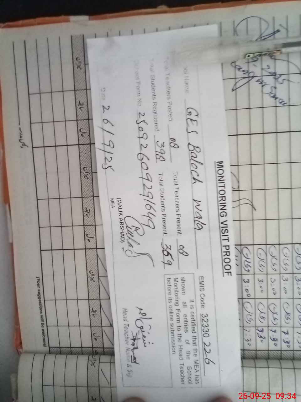 | Attendance Register | Head Teacher | MEA with School | Visit Proof |