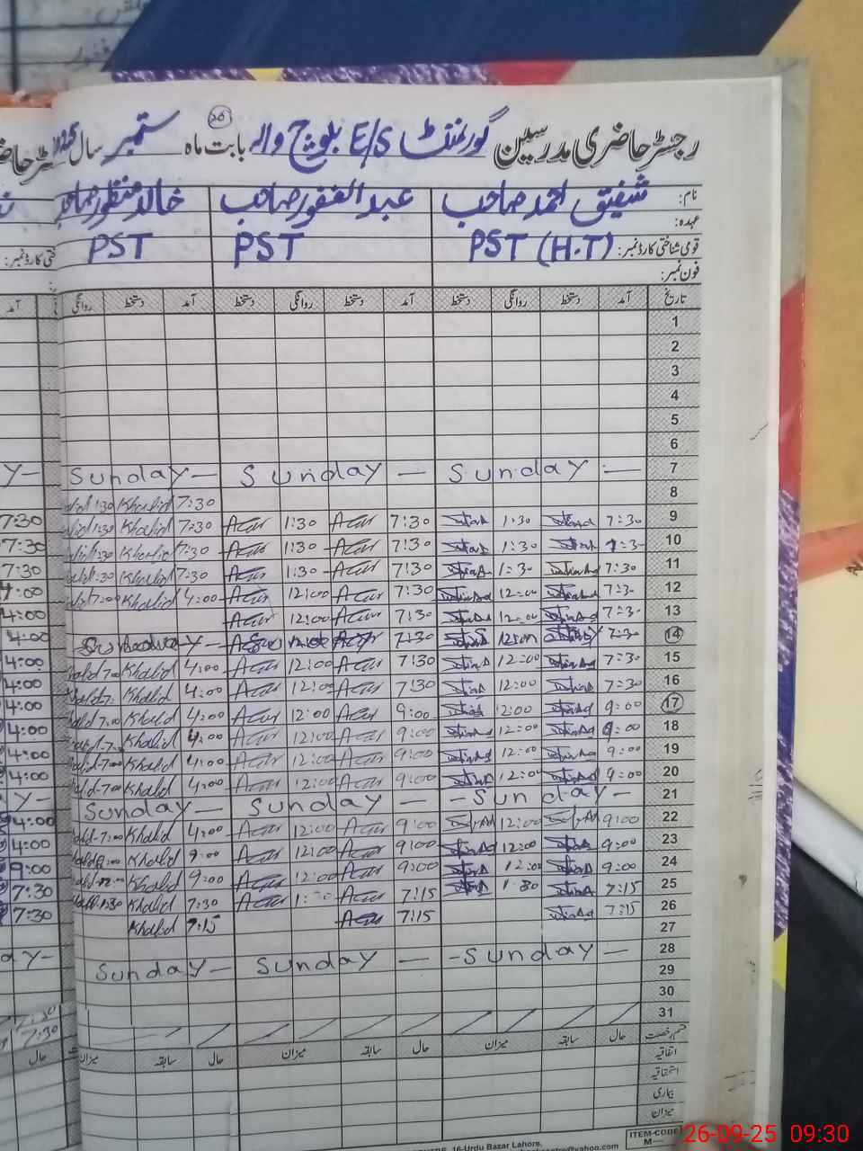 | CNIC | Full Name | Designation | R/C | Absence During Last Calender Month |