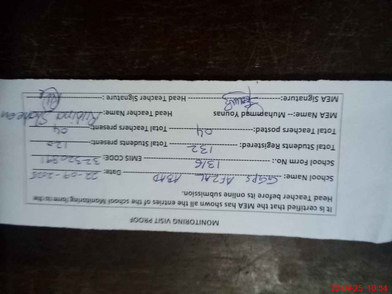 | Attendance Register | Head Teacher | MEA with School | Visit Proof |