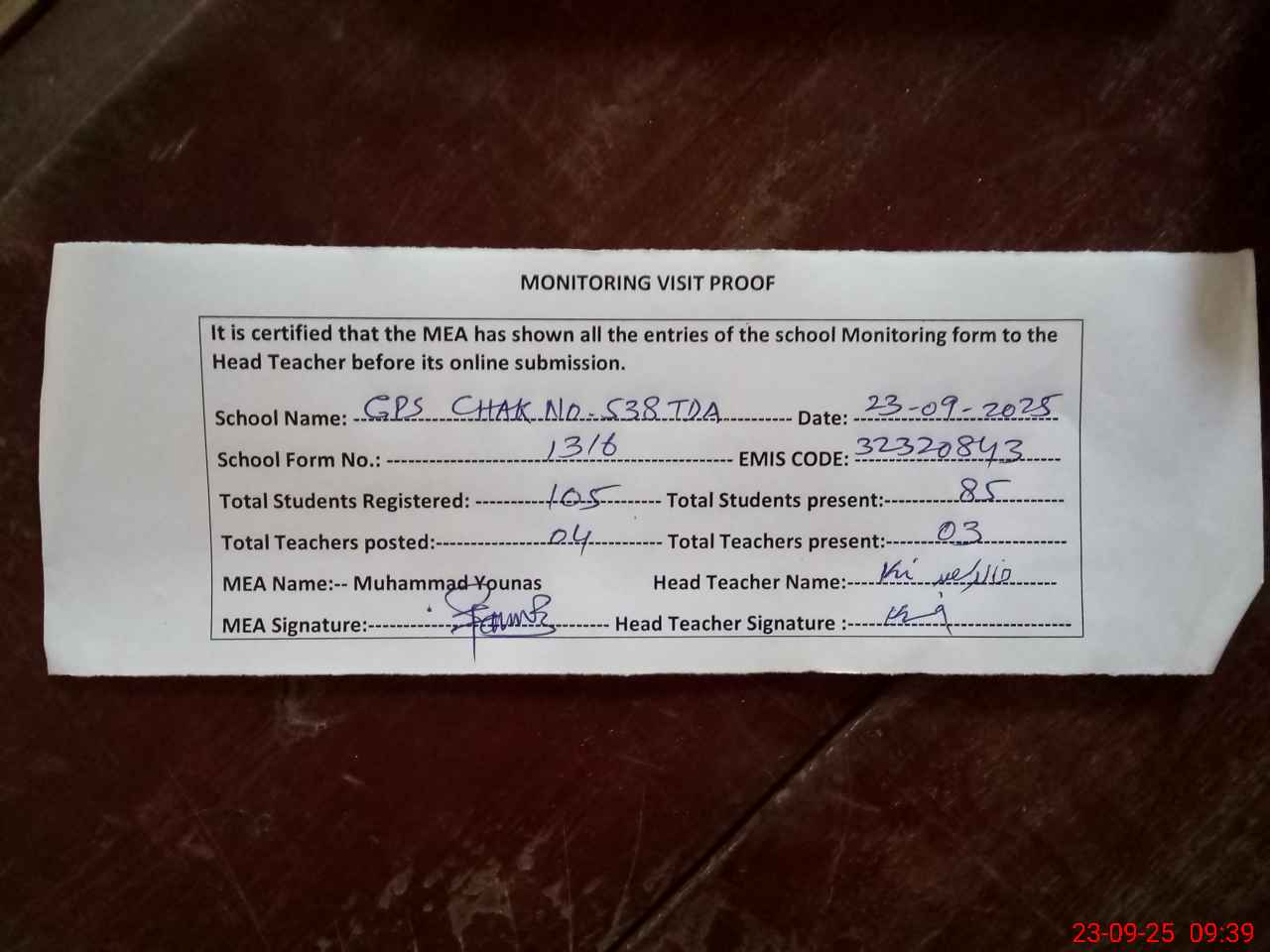 | Attendance Register | Head Teacher | MEA with School | Visit Proof |