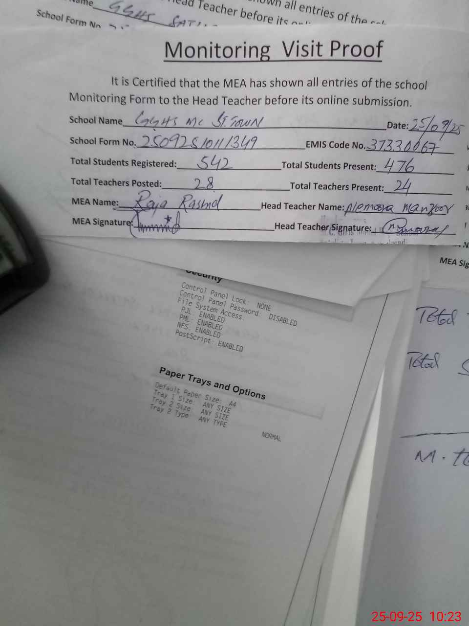 | Attendance Register | Head Teacher | MEA with School | Visit Proof |