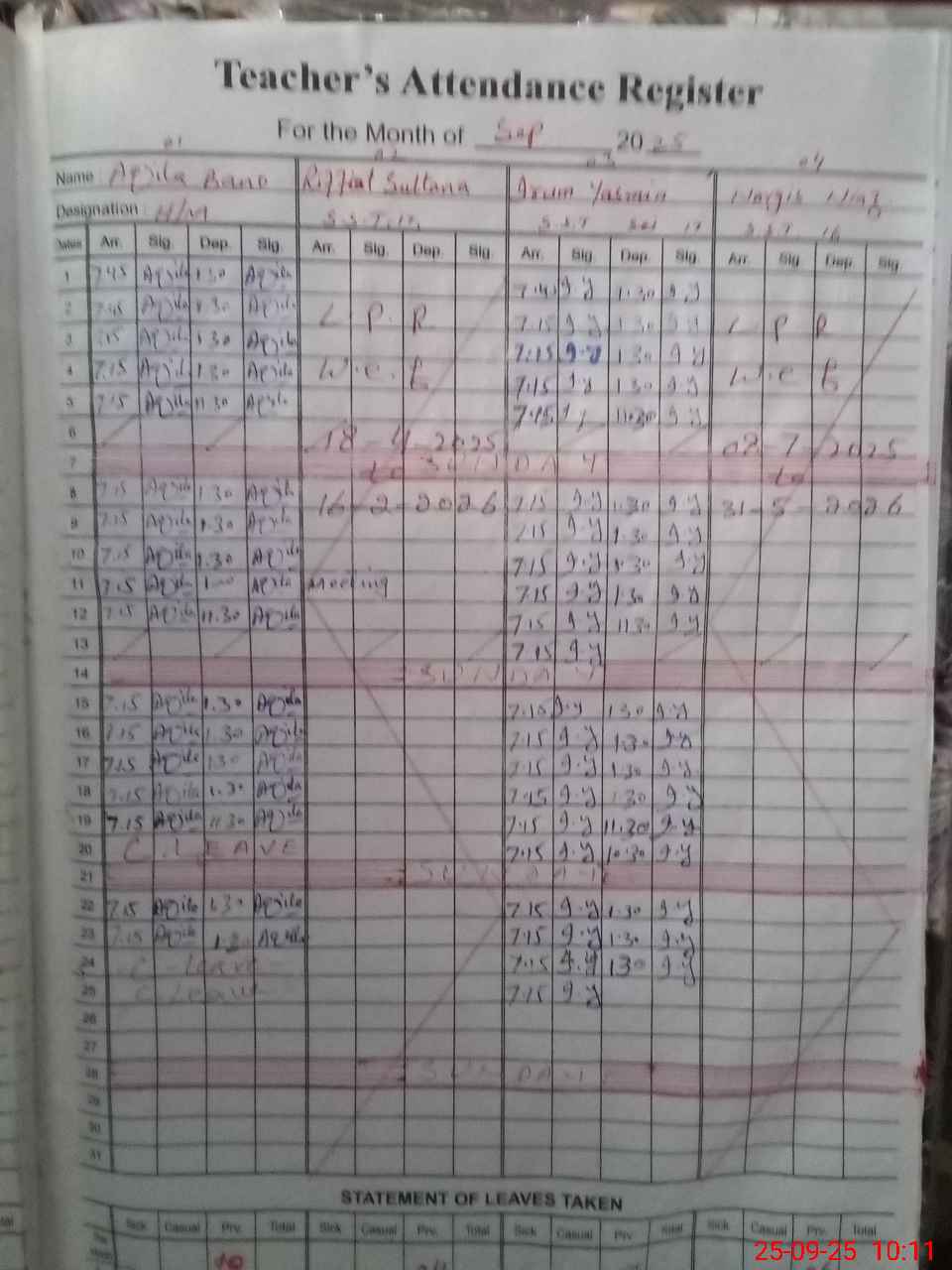 | Leave | Duty | Absent | Maternity | Medical | Ex- Pak |