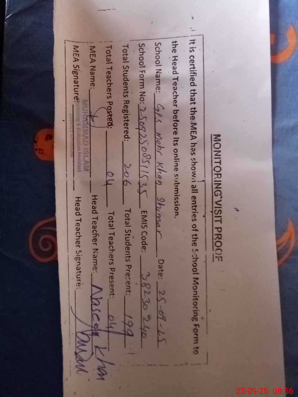 | Attendance Register | Head Teacher | MEA with School | Visit Proof |