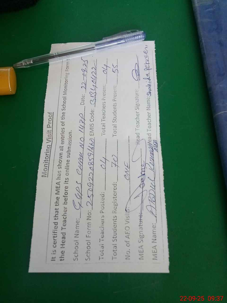 | Attendance Register | Head Teacher | MEA with School | Visit Proof |