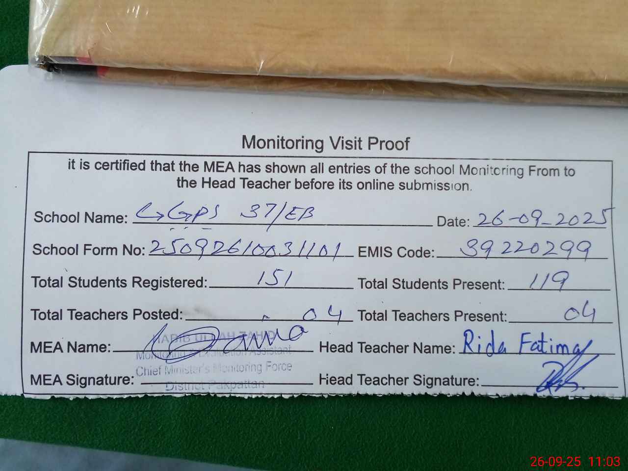 | Attendance Register | Head Teacher | MEA with School | Visit Proof |