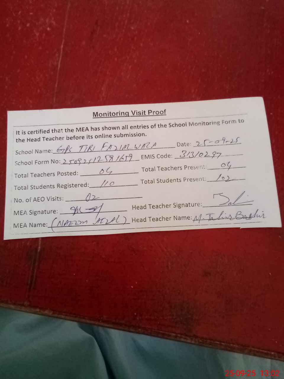 | Attendance Register | Head Teacher | MEA with School | Visit Proof |