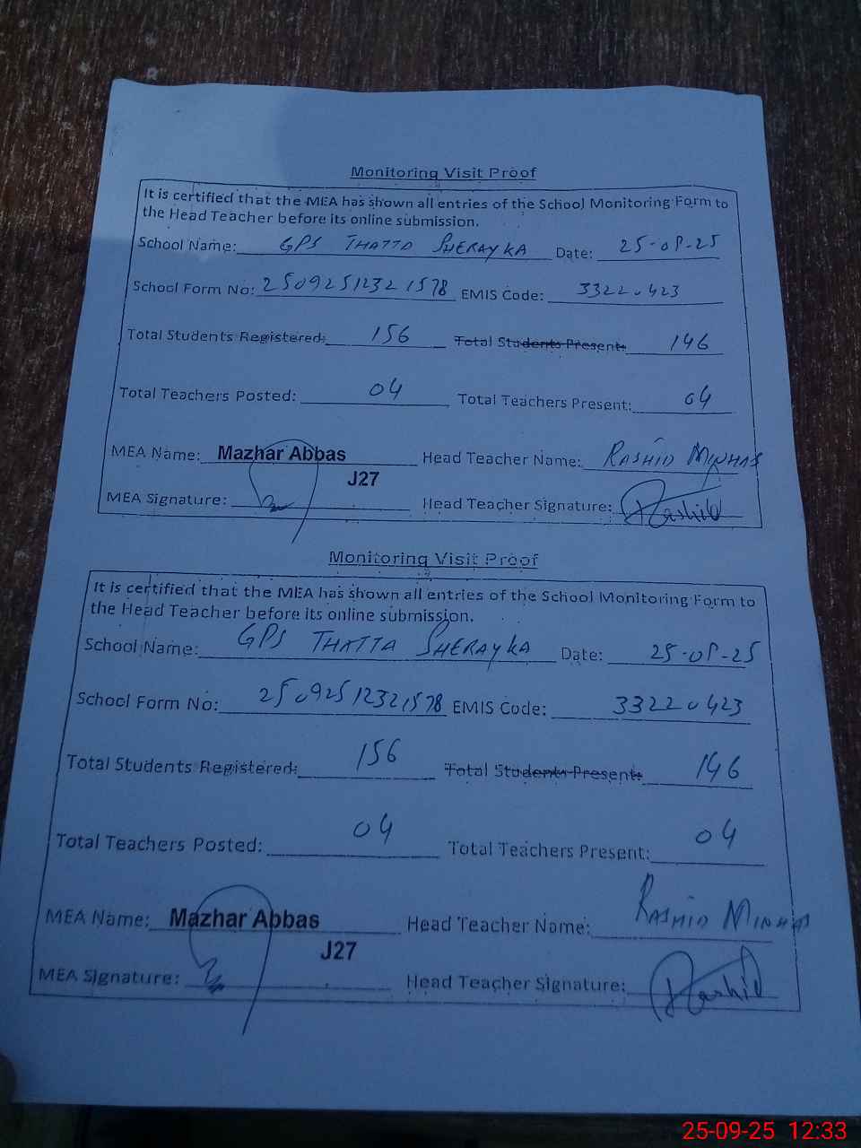 | EMIS Code: 33220423 | Name of School: GPS THATHA SHER E KA (De-consolidated April-2016) | |||