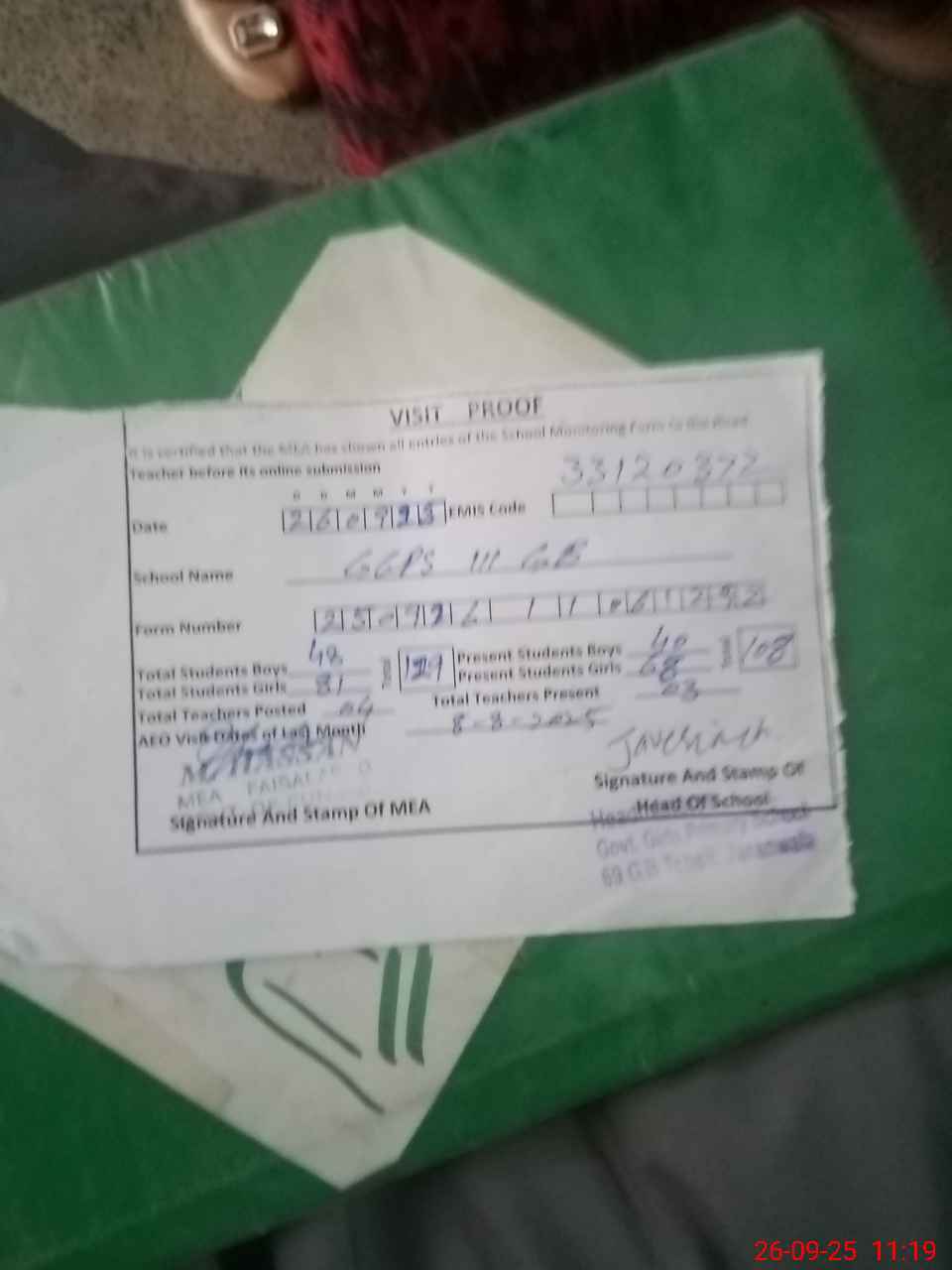 | Attendance Register | Head Teacher | MEA with School | Visit Proof |