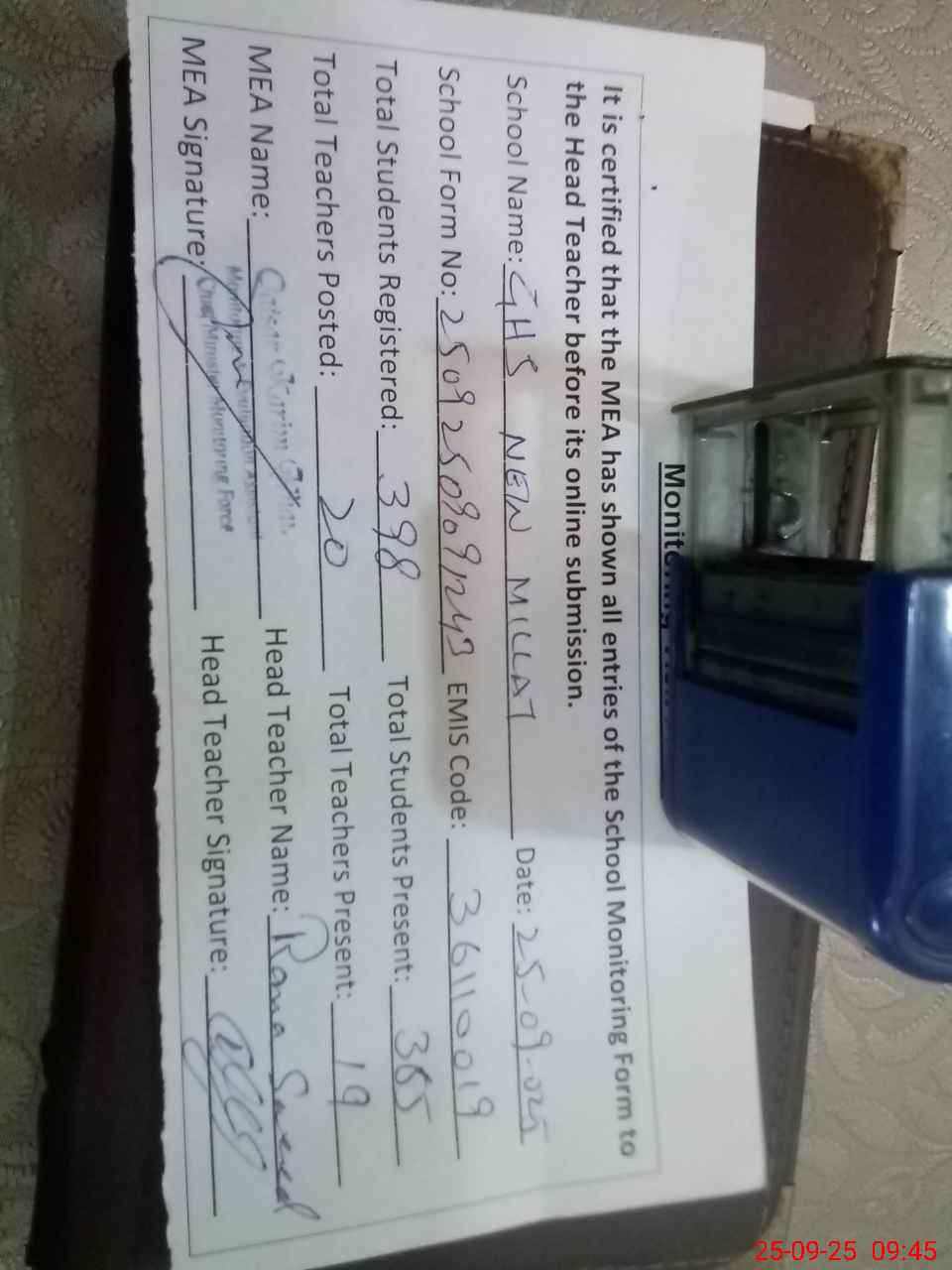 | Certified that this School was Inspected by the Undersigned MEA/DMO Today and the Information Stated Above is as Per Record. | |||||