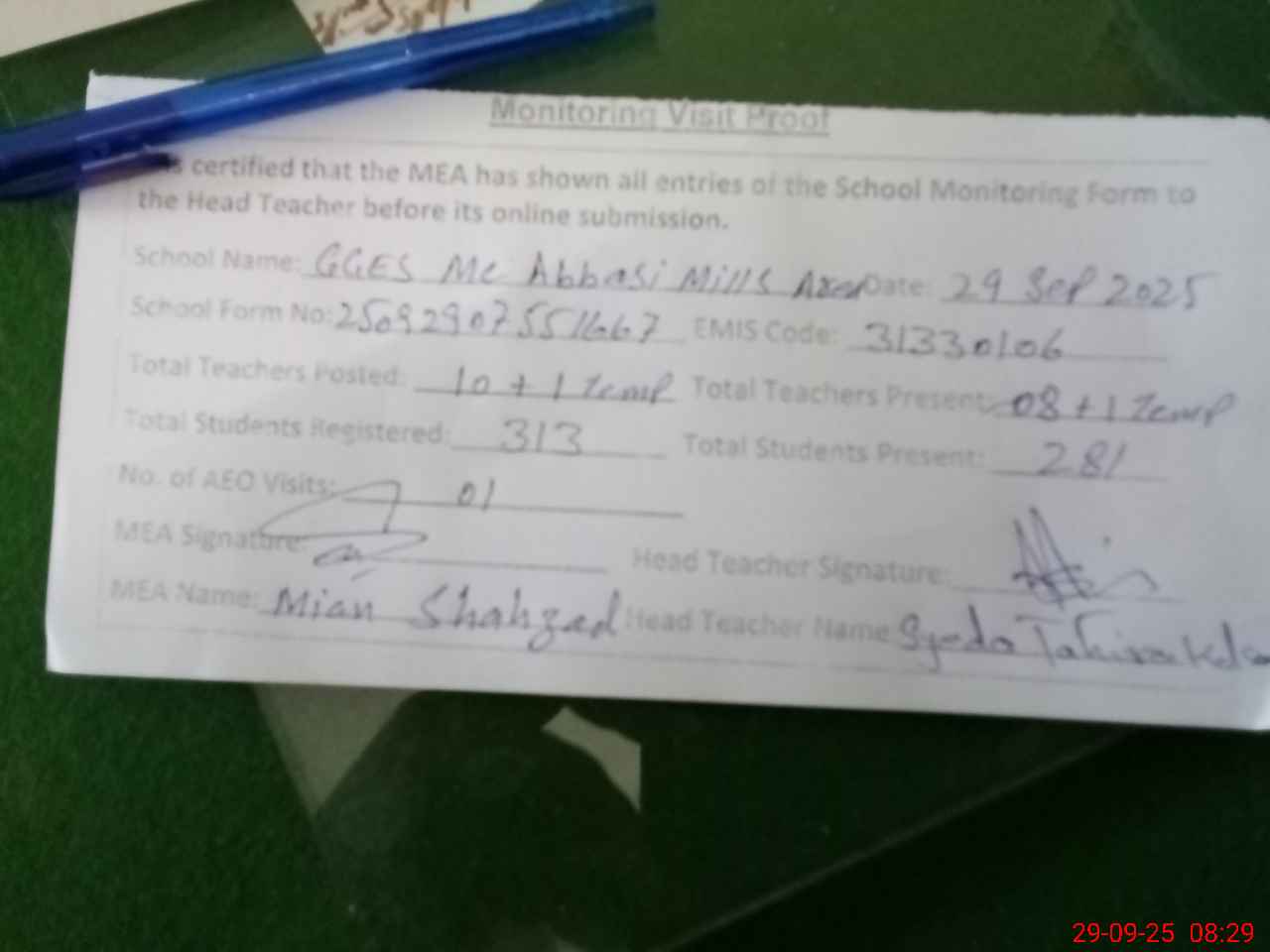| Attendance Register | Head Teacher | MEA with School | Visit Proof |