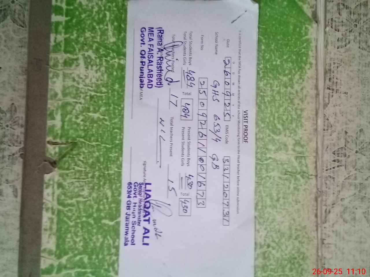 | EMIS Code: 33120731 | Name of School: GHS CHAK NO 653/4 GB | |||
