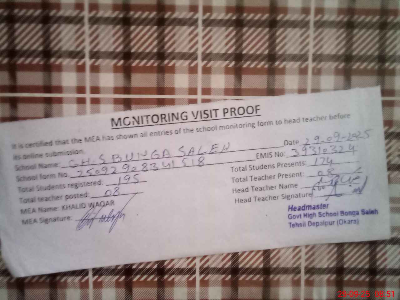 | Monitoring Date: 29-09-2025 | Start Time: 29-09-2025 08:25 AM | End Time: 29-09-2025 08:52 AM | Name of MEA: KH**** WA**** | |