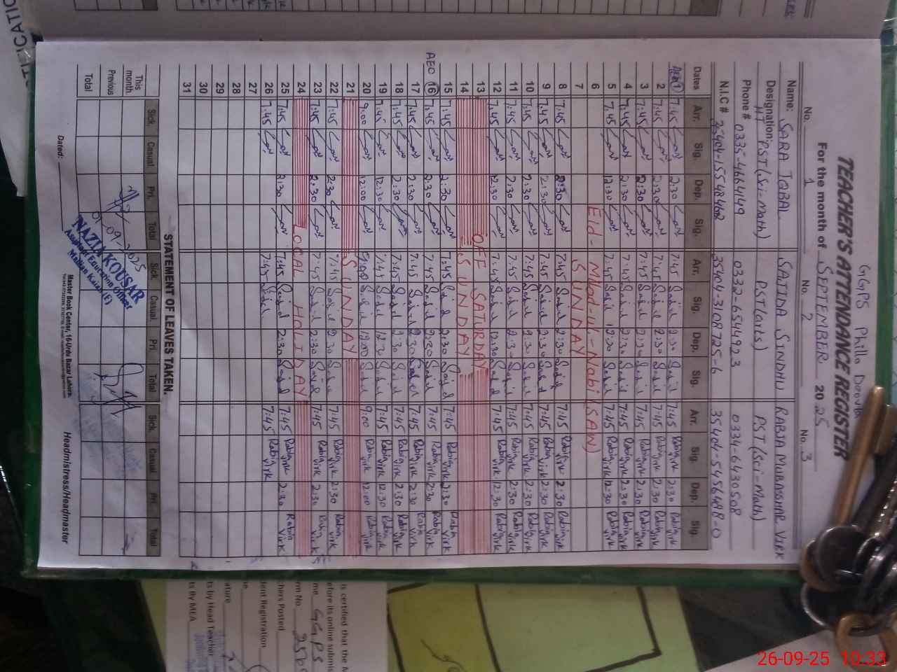 | Name: SA**** IQ**** Designation: (School Headmaster's/Headmistress's) PST Phone/Cell Number: 03**** |