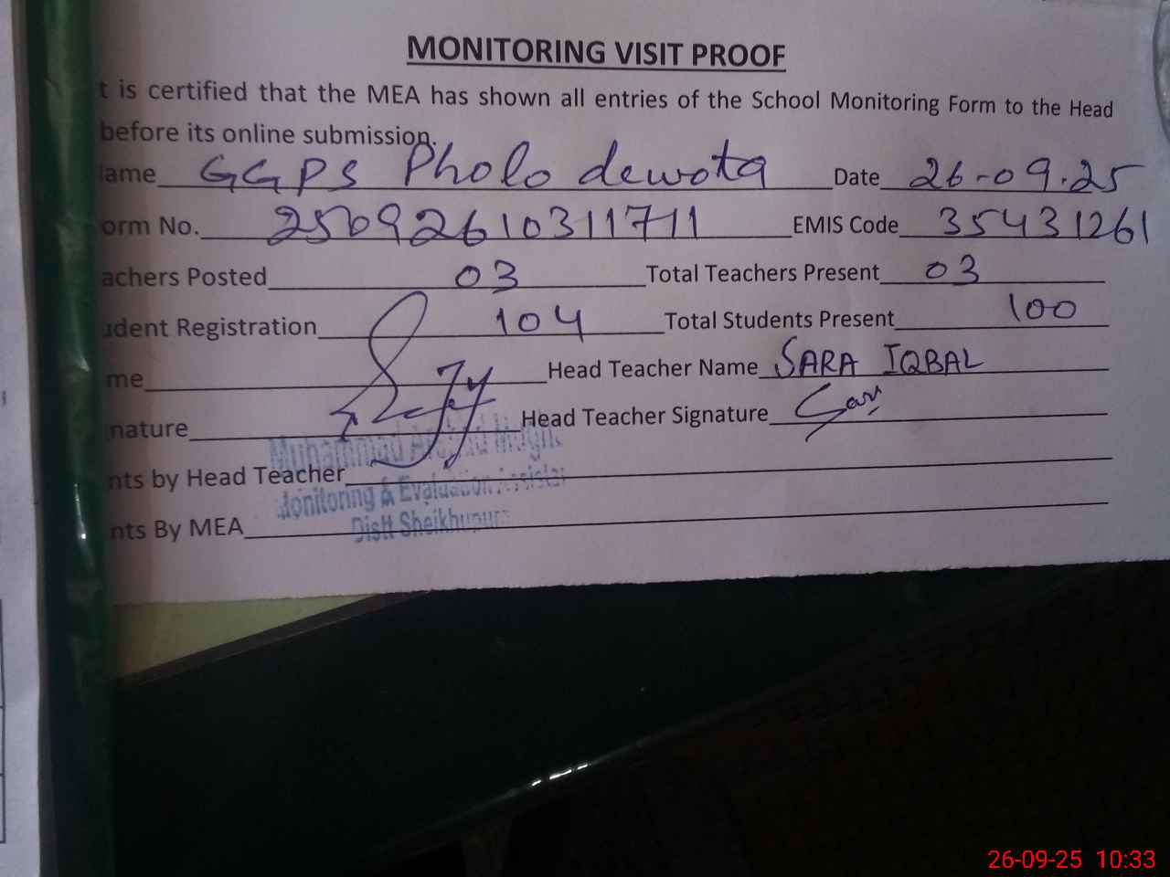 | Attendance Register | Head Teacher | MEA with School | Visit Proof |