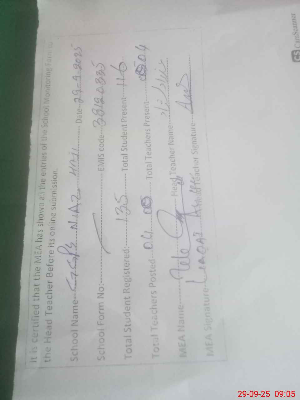 | Attendance Register | Head Teacher | MEA with School | Visit Proof |