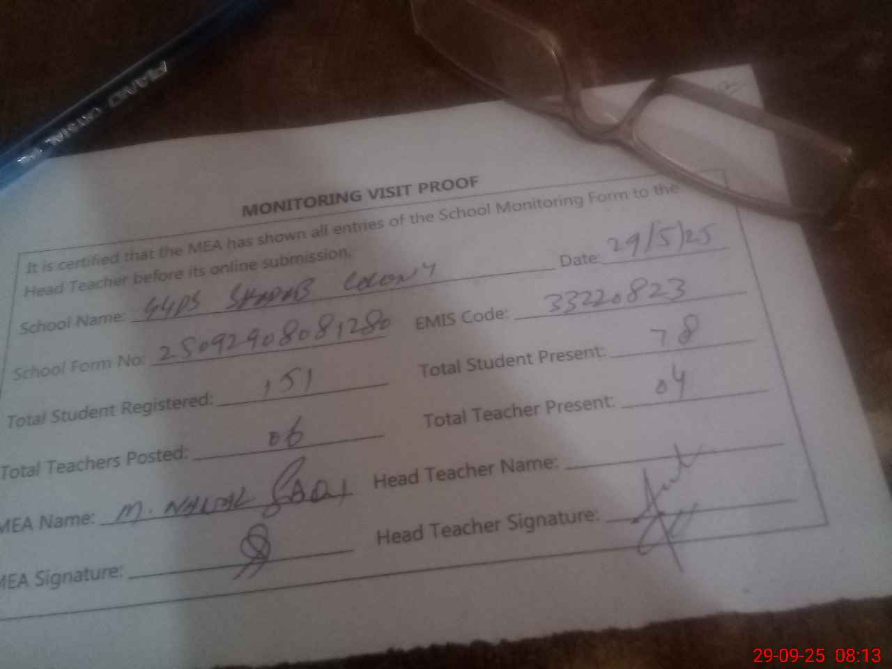 | Attendance Register | Head Teacher | MEA with School | Visit Proof |