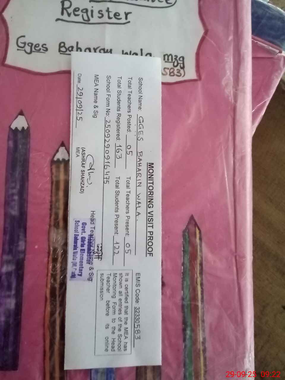| EMIS Code: 32330583 | Name of School: GGES BAHARAY WALA | |||